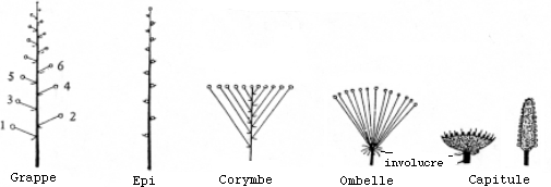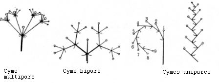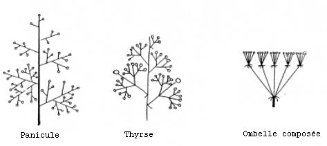 Corymbiforme : désigne une inflorescence où les pédoncules sont de longueur inégale mais où toutes les fleurs sont sur un même plan.