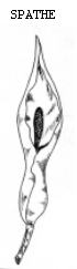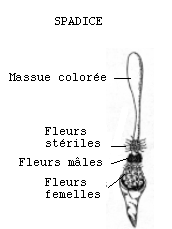 Spadice : inflorescence indéfinie, à fleurs sessiles unisexuées portées par un axe plus ou moins charnus comportant : un appendice ou massue coloré(e) des fleurs stériles, des fleurs mâles et des fleurs femelles.