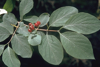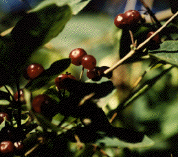 - Fruits : baies rouges, luisantes, réunies par 2, légèrement