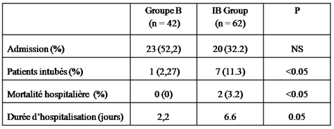 But de l’étudeComparer l’efficacité de l’association Bricanyl + Atrovent en nébulisation par rapport au bricanyl. MéthodologieEtude prospective, randomisée en double aveugle. Randomisation en deux groupes : Groupe atrovent bricanyl (AB ;n= 62) et Groupe bricanyl (B ;n= 44) en nébulisation une nébulisation toutes les 30 min/2 heures. Critères de jugement primaires : l'admission à l’hôpital, l'intubation et la mortalité hospitalière. critères de jugement secondaires : amélioration de débit expiratoire de pointe, GDS, score de dyspnée pendant les 3H Résultats